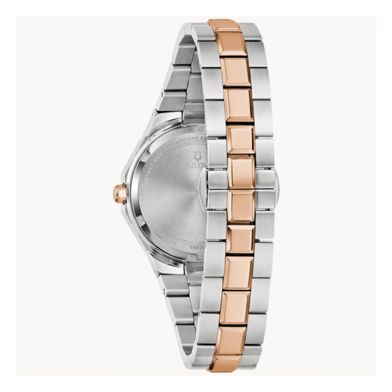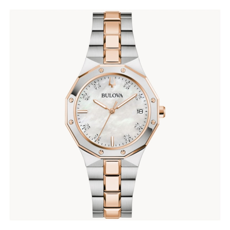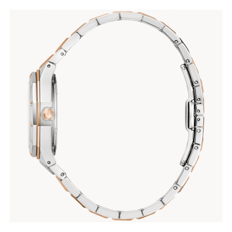 這款經典的Bulova Prestige女性手錶以大膽而高雅的設計為特徵,完美平衡了大膽的設計與優雅的存在。手錶配有一個32毫米的多面玫瑰金和銀色不銹鋼錶殼,幾何形狀的錶圈,平面藍寶石水晶,抗反射塗層,防水深度達100米,以及一個經過倒角處理的三鏈手鐲,具有磨砂與拋光的飾面及按鈕展開扣合。閃亮的母貝錶盤上有玫瑰金色指針和以Super-LumiNova發光填充的標記,8顆耀眼的鑽石,以及日期顯示。這款Bulova女士手錶在現代感和精緻感上都頗具衝擊力,是任何手腕上的理想伴侶。