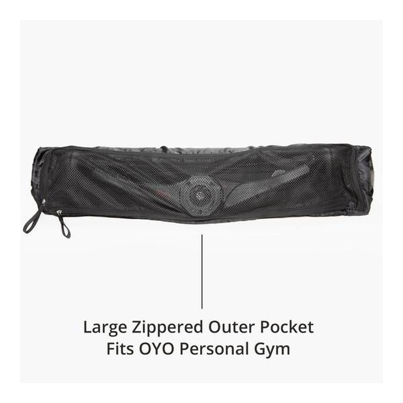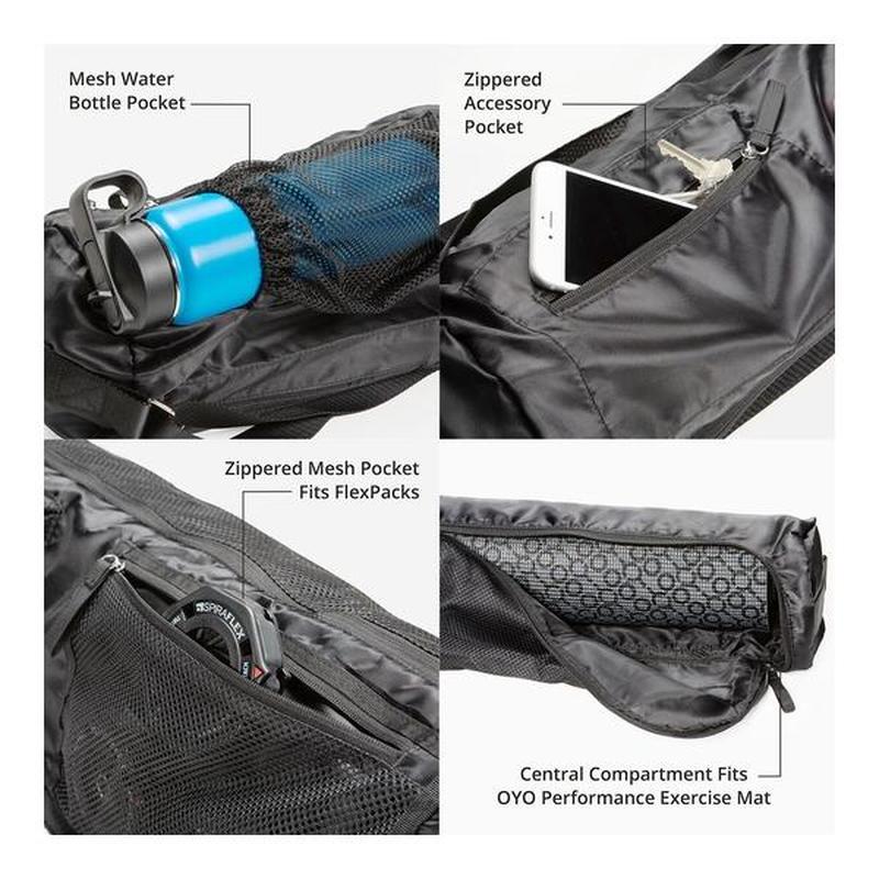 OYO Fitness Carry-All 美國健身瑜伽袋由耐用的尼龍製成,中央隔層可放置運動墊/瑜伽墊,外部網眼拉鍊口袋可放置您的 NOVA 或 OYO 便攜式健身器,兩個額外的拉鍊口袋可存放配件,以及可輕鬆放入水瓶的側袋。